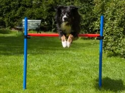 Die Sprünghürde aus wetterfestem Kunststoff ist kinderleicht aufgebaut und mit Erdspießen im Boden fixiert. Im Gegensatz zu herkömmlichen Hürden, bei denen die Sprungstange fest mit den Seitenteilen verbunden ist, wird die Sprungstange des Agility Sets nur auf die mitgelieferten, höhenverstellbaren Träger aufgelegt. So ist sichergestellt, dass sich dein Hund, sollte er die Sprungstange streifen, nicht verletzten kann, weil die Sprungstange dann einfach herunterfallen kann.
