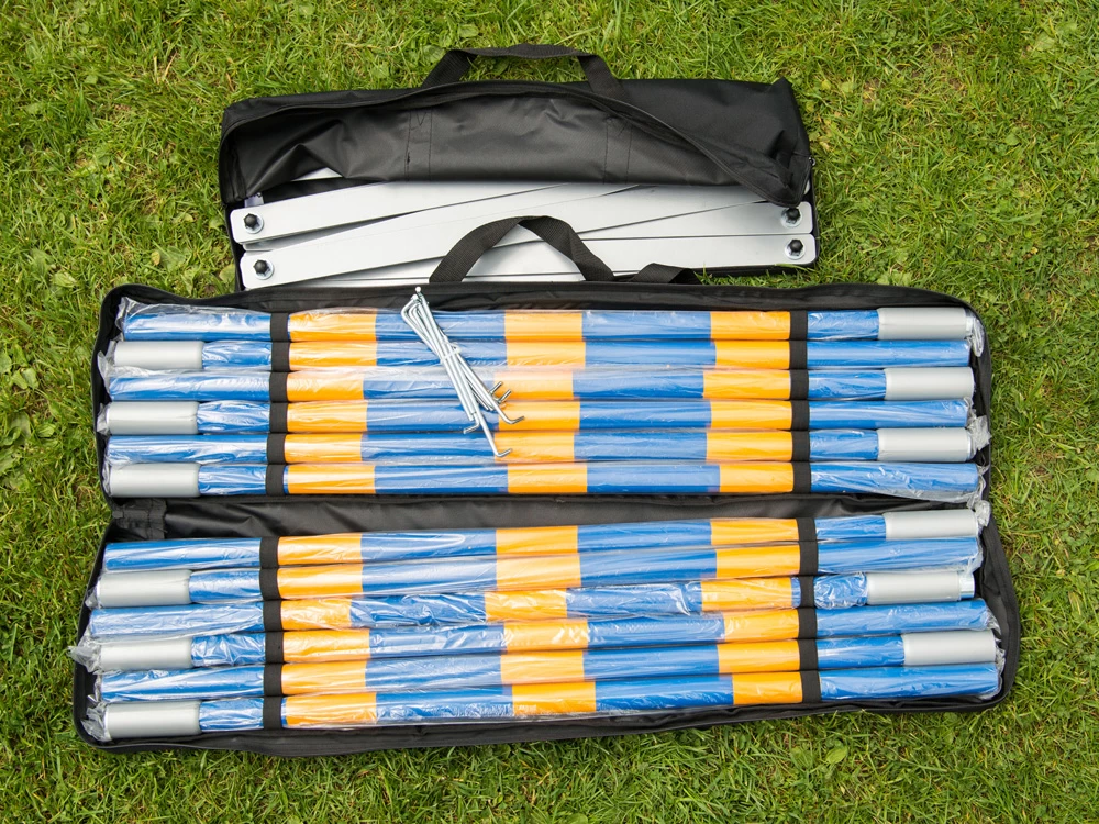 Der Aufbau ist kinderleicht, und transportiert wird der Slalomparcours in 2 mitgelieferten Transporttaschen. Darin ist der Slamom zerlegt und ordentlich verstaut und findet z.B. im Auto sogar hinter dem Beifahrersitz im FuĂźraum platz.