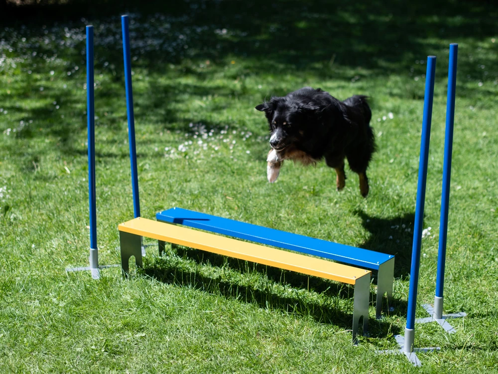 Weitsprung-Einsteiger beginnen zur Eingewöhnung mit dem niedrigsten Weitsprungelement. Im Laufe des Trainings werden nach und nach die weiteren Elemente dazugestellt. So wird die Sprungweite und Sprunghöhe die dein Hund leisten muss erhöht.