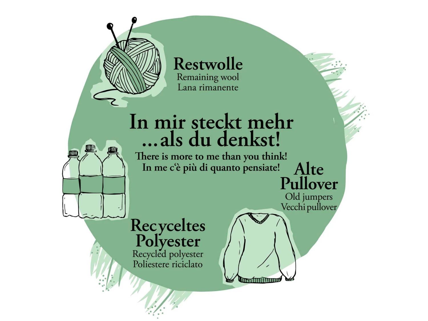 - Material: Wolle (upgecycelt, Polyester (recycelt)